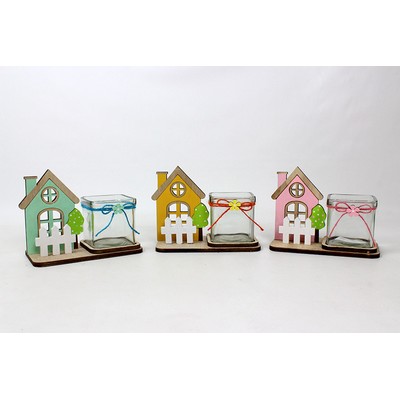 - 680052 - Maison bois + pot en verre (7,5x7,5) couleurs assorties - 17x9xh14 cm